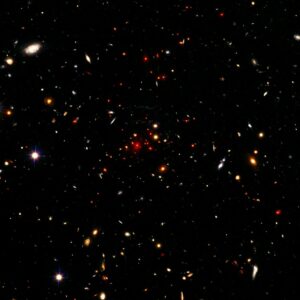 شکل ۲: کیهان مکانی گسترده، متنوع و جالب، مملو از ماده و انرژی است که به اشکال گوناگون در صحنهی فضا-زمان مطابق با قوانین فیزیک کار میکند. این تصویر با تلسکوپ فضایی هابل از خوشهی کهکشانی IDCS J1426.5+3508 گرفته شده است. در حالی که این قطعا نمونهای از «چیزی» است که در کیهان وجود دارد، آیا اصلا «هیچ» حتی از نظر فیزیکی هم میتواند وجود داشته باشد؟