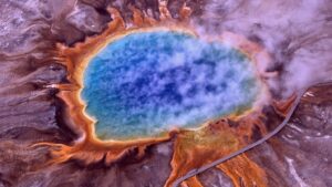 شکل ۴: این تصویر هوایی از چشمهی گراندپریسماتیک در پارک ملی یلو استون یکی از نمادینترین نمونههای محیطهای گرمابی در خشکیهای جهان است. تشکیل رنگها به دلیل وجود موجودات گوناگونی است که در این شرایط سخت زندگی میکنند و به میزان نور خورشیدی که به قسمتهای گوناگون چشمه میرسد، بستگی دارد. میدانهای گرمابی مانند این چشمه، یکی از بهترین مکانهای منتخب برای آغاز حیات ابتدایی هستند که برای نخستین بار در زمین جوان پدید آمدهاند و حتی ممکن است خانهی حیات غنی در انواع گوناگون سیارات فراخورشیدی باشند.